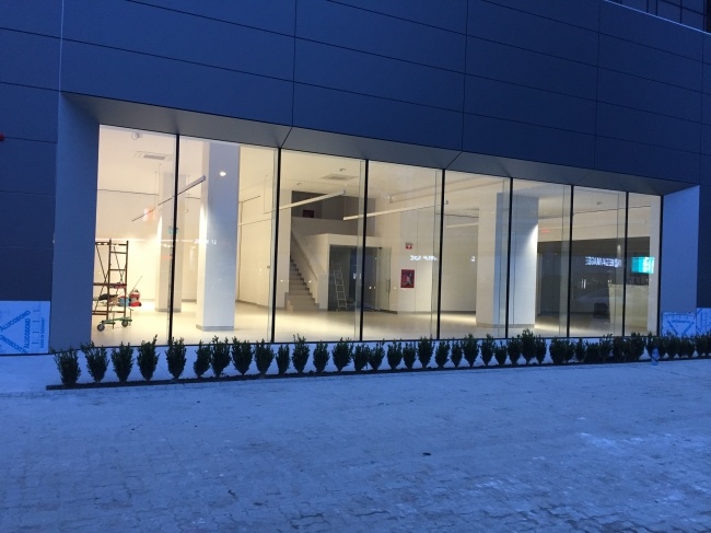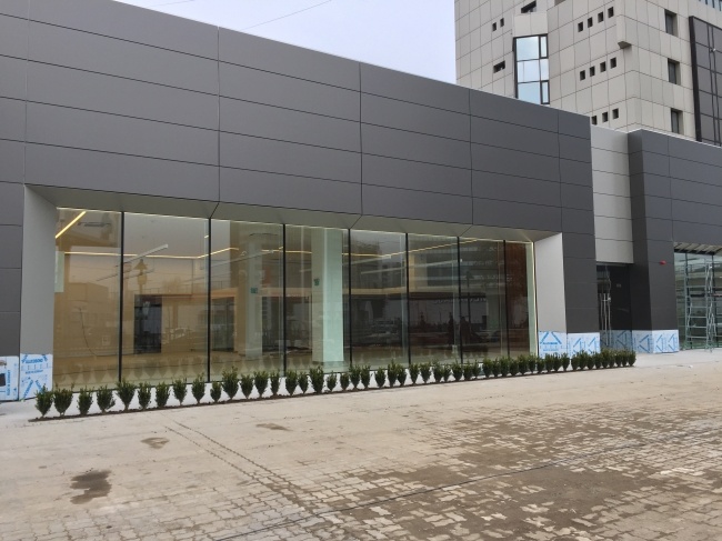 - Curtain walls made of glass panels secured with structural glass pillars